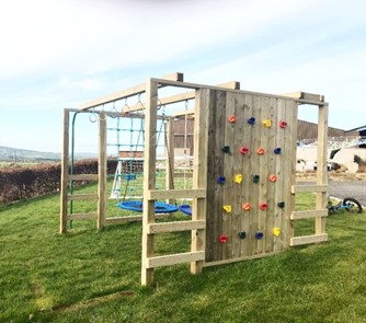 Ladder, Rockwall, Monkey Bars, Monkey rings, Cargo Rope ladder, option of two swing attachments. Slide can also be added.
